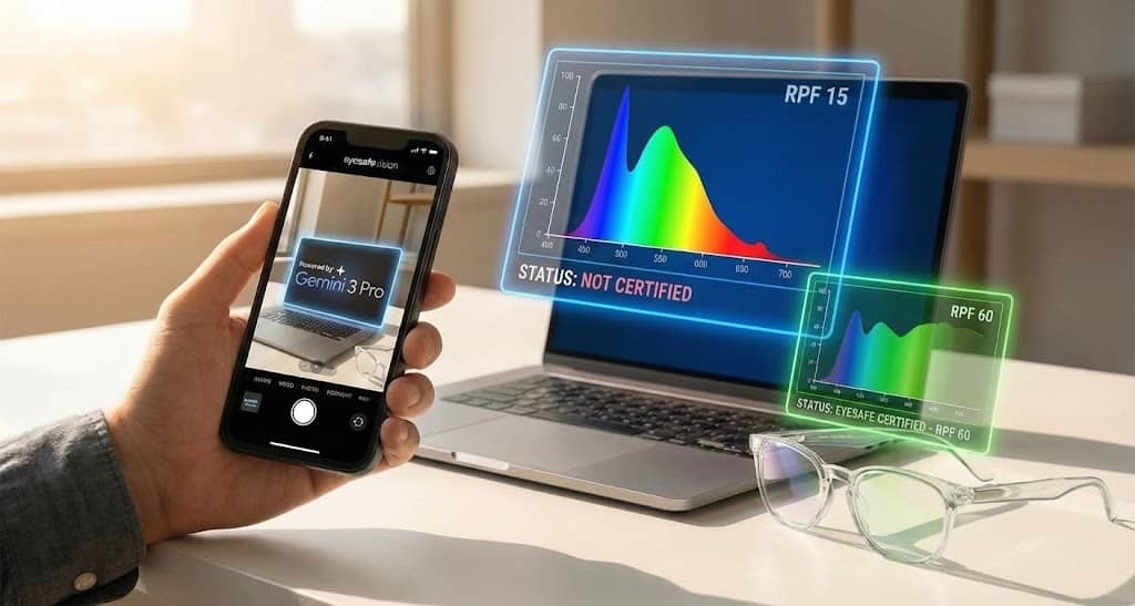 Turn your phone into an advanced blue light scanner with Eyesafe Vision. Powered by Gemini 3 Pro, it instantly reveals invisible screen emissions. Simply point and scan to analyze high-energy blue light peaks and verify your device’s Radiance Protection Factor (RPF).