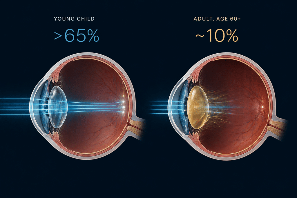 The single most important — and least understood — fact about pediatric vision is that a child’s eye is optically different from an adult’s. It is more transparent.