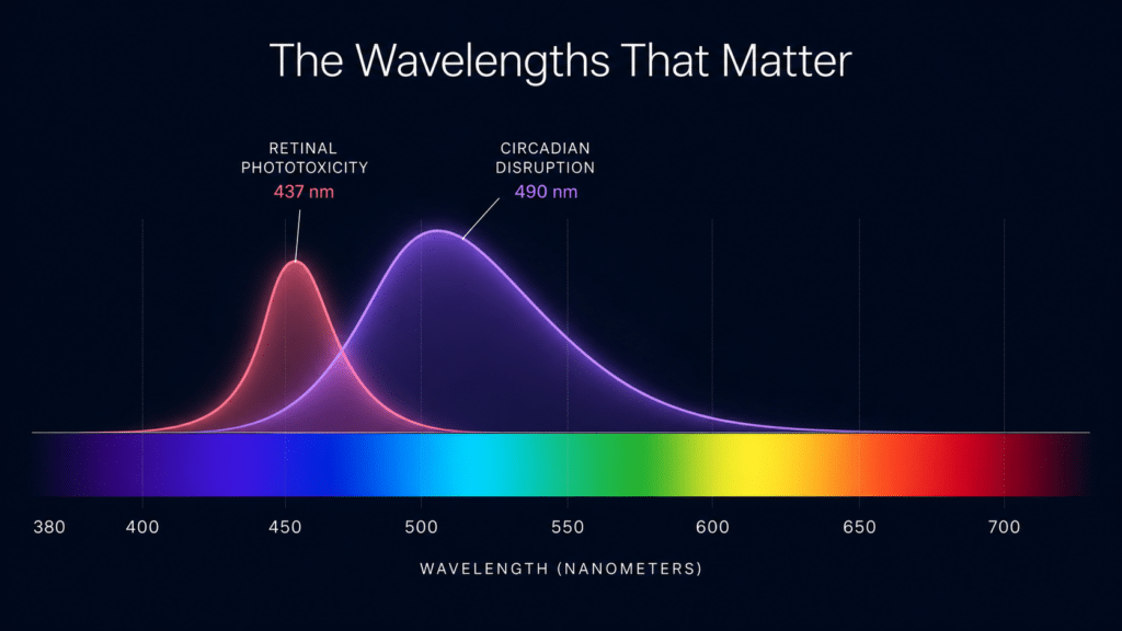 - 480–500 nm — the wavelengths most responsible for melatonin suppression and circadian disruption.